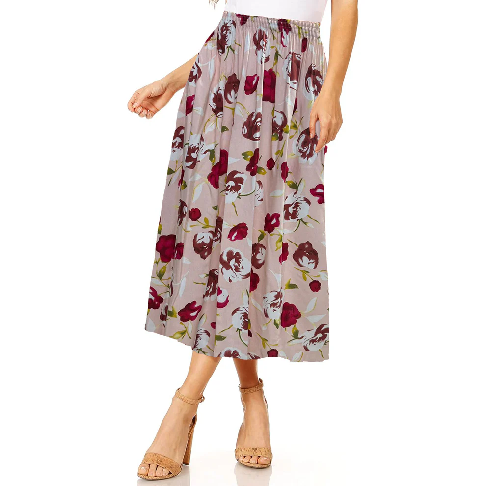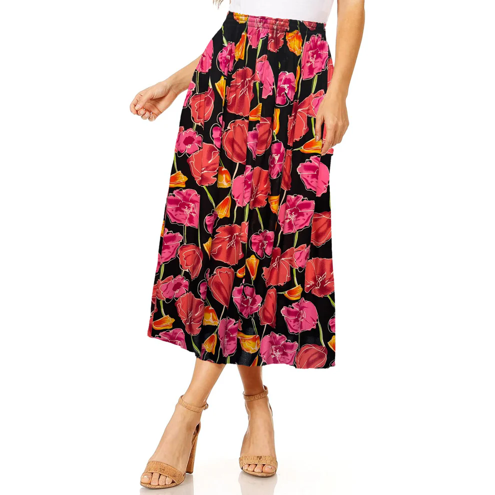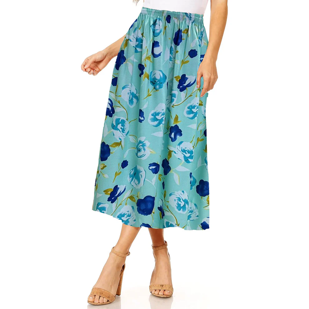 The Women's Floral Midi Skirt is a stylish and comfortable summer essential featuring a lively floral print, a breezy 77 cm mid-length cut, and a stretchy elastic waistband. Made from a soft elastane blend, it offers breathability and flexibility for all-day wear. Suitable for both casual and dressy occasions, it’s available in sizes S to XXL and is easy to care for with machine washability. Perfect for beach trips, picnics, or festive gatherings.